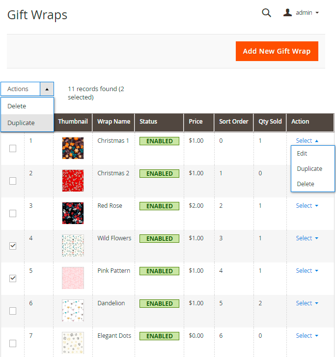 Conveniently manage all gift wraps in a grid. Choose any to delete, duplicate or edit. Also, you can create a new wrap in just a couple of clicks. Please, go to Catalog → Gift Wraps.