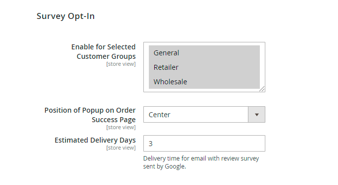 Enable for Selected Customer Groups - choose particular customer groups for which a survey request will be displayed. You may leave this field empty to disable survey gathering (for exampe, if you have already collected the necessary amount of reviews for a high rating).