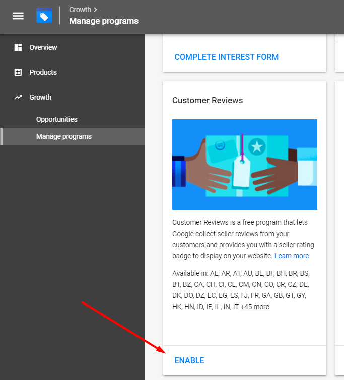 Then, go to Growth → Manage Programs → Customer Reviews and enable reviews.