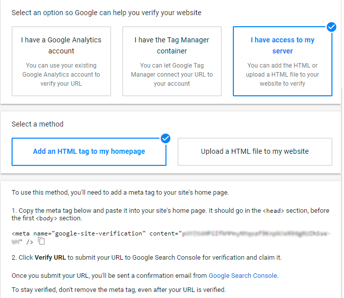 You may choose any type of verification, e.g. via pasting the necessary code into your home page heading.