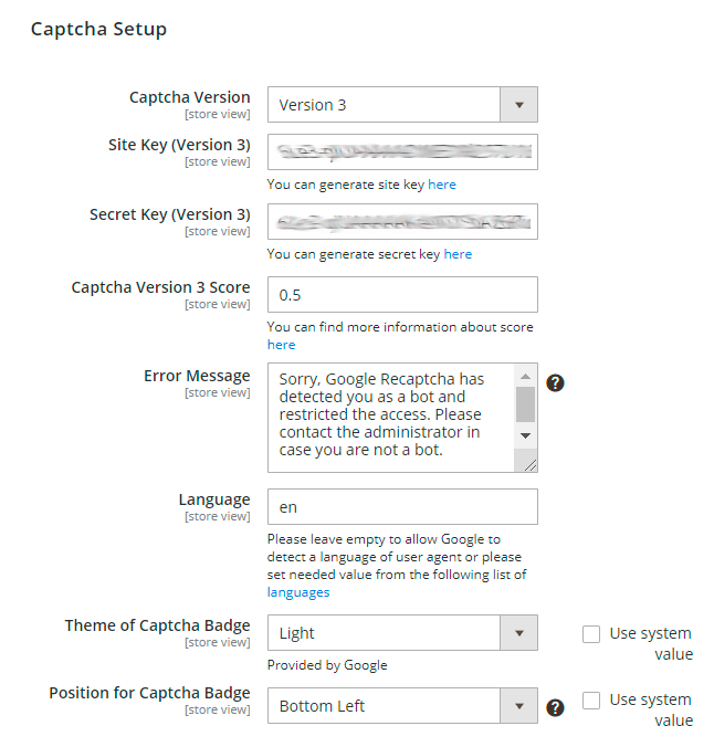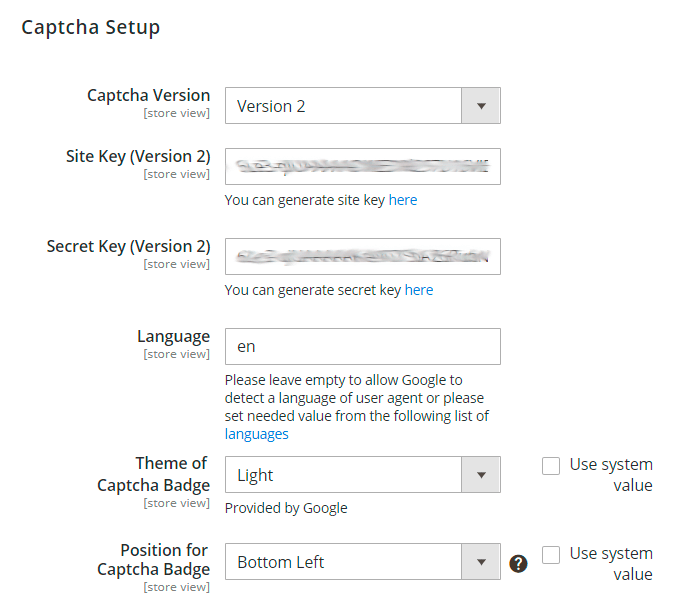Site Key and Secret Key - enter the values of both keys you obtained on the Admin panel in Google. To learn step-by-step how to get Site Key and Secret Key, please read the Connect reCaptcha to the Extension block.