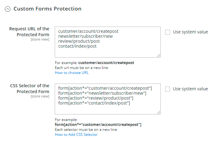 3. In our case, the selector is .customer-account-create .account-create form and we add it to the CSS Selector of the Protected Form field.