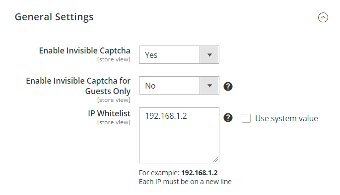 To get the access to the 'Invisible Captcha' settings, please go to Stores → Configuration → Amasty extensions → Google Invisible Captcha and expand the General Settings section.