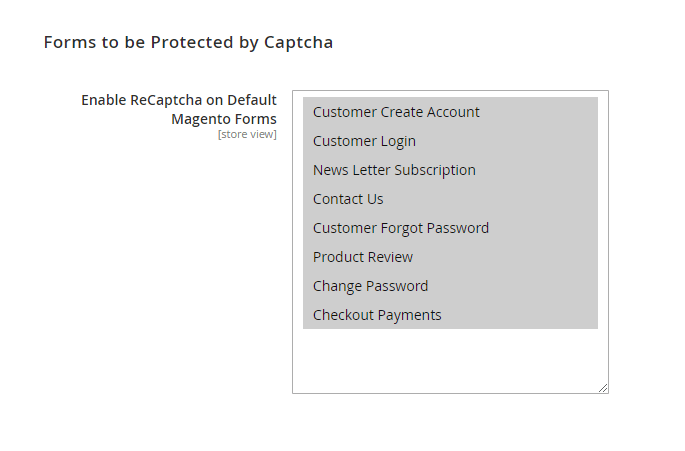 Enable ReCaptcha on Default Magento Forms - choose from the list on which default Magento forms to enable ReCaptcha.