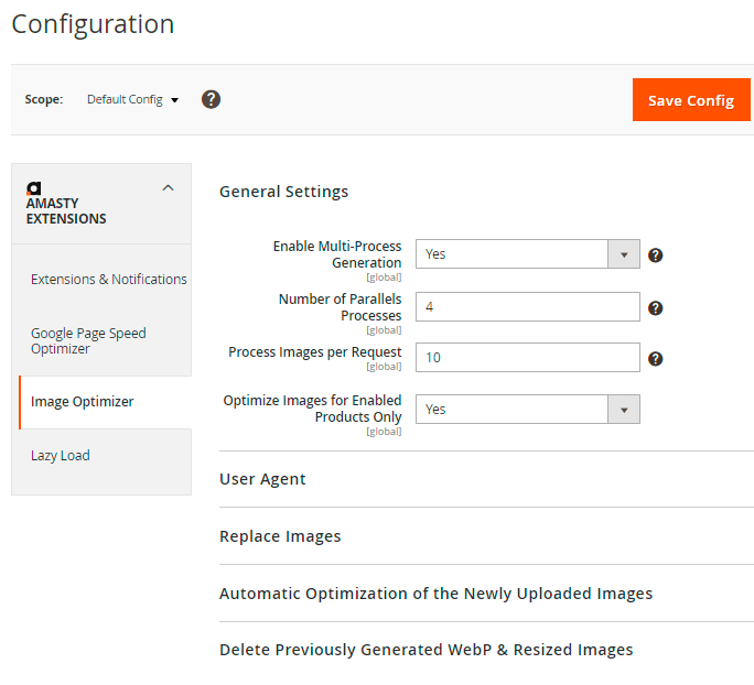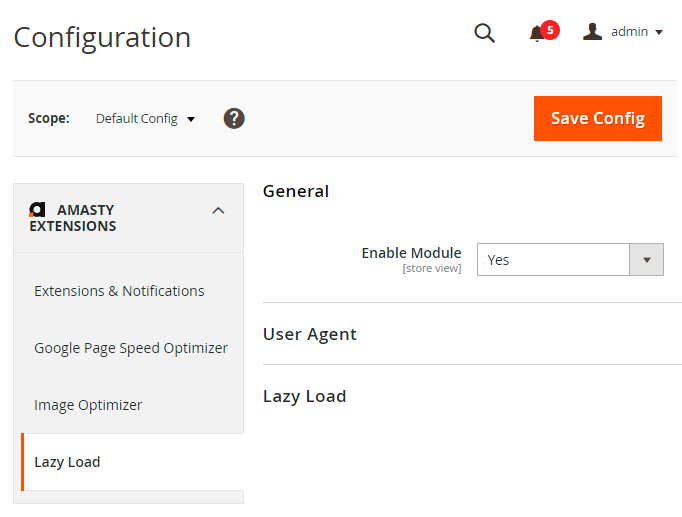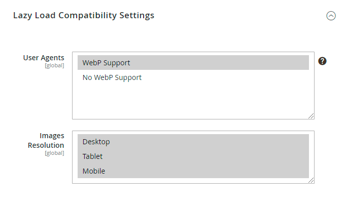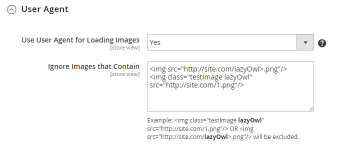 If you have Image Optimizer installed, you will be able to configure the user agent for lazy load functionality. Expand the User Agent tab to adjust settings for image loading according to the customer's browser user agent.