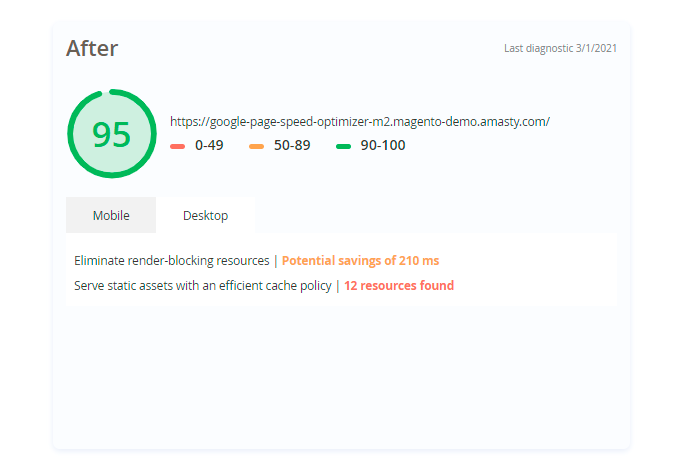 You may see the desktop and mobile page speed scores separately. The informative block also contains Google recommendations.