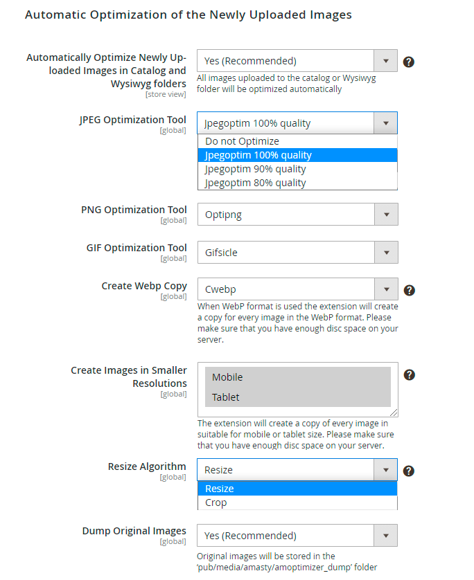 Automatically Optimize Images in catalog or Wysiwyg folder - set to Yes to optimize all images uploaded to the catalog or Wysiwyg folder automatically.
