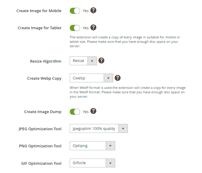 Create Image Dump - set to Yes to to store original images in the pub/media/amasty/amoptimizer_dump folder. It allows collect all the original files in one place and easily update them in case the settings are changed.