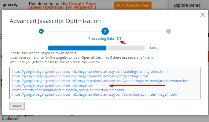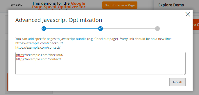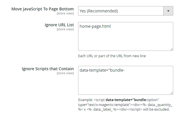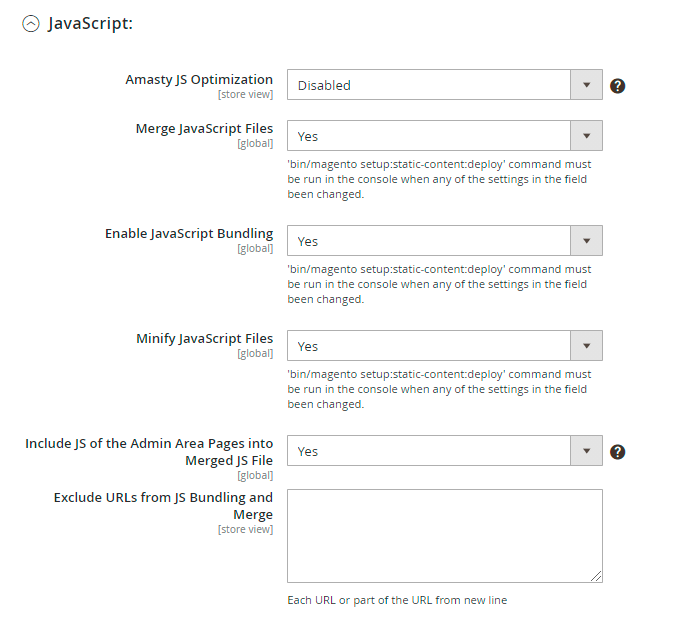 If Amasty JS Optimization is Disabled, you can customize the way of code optimization. Besides Moving JS To Page Bottom, there are 4 additional options to reduce your JS code. You can also exclude particular URLs and scripts.