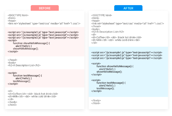 Move JavaScript To Page Bottom option helps to load all the important content before loading JS. The functionality improves pages loading time.