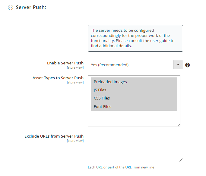 Exclude URLs from Server Push - provide particular URLs to exclude from the push.