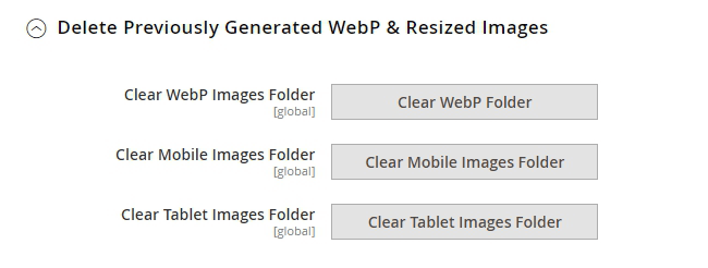 Clear Images Folder - the Clear WebP Images Folder / Clear Mobile Images Folder / Clear Tablet Images Folder buttons delete the optimized files from the pub / media / amasty / folder_name folders, depending on which button is pressed. It is used if the previously selected optimization settings were inconvenient to use and there is a need to re-generate the queue and re-optimize the images.