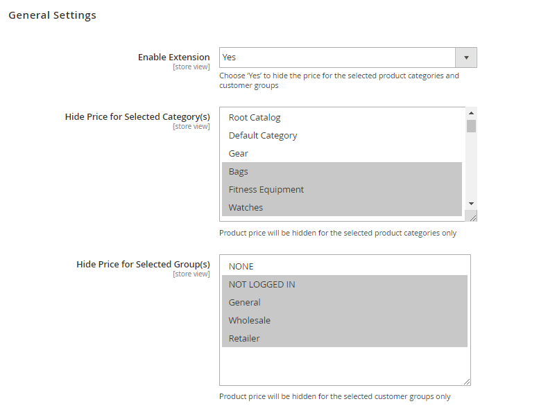 Hide Price for Selected Group(s) - select a customer group (groups) for which the prices in selected above categories will be hidden.