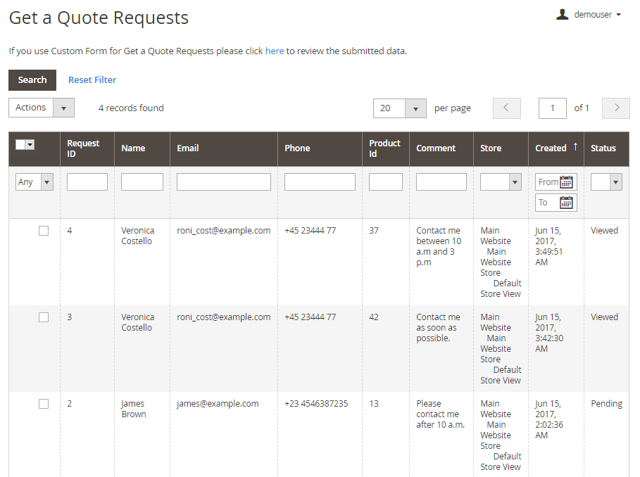 All “Get a Quote Requests” are displayed in a special grid. To see the grid please go to Marketing → Get a Quote Requests.