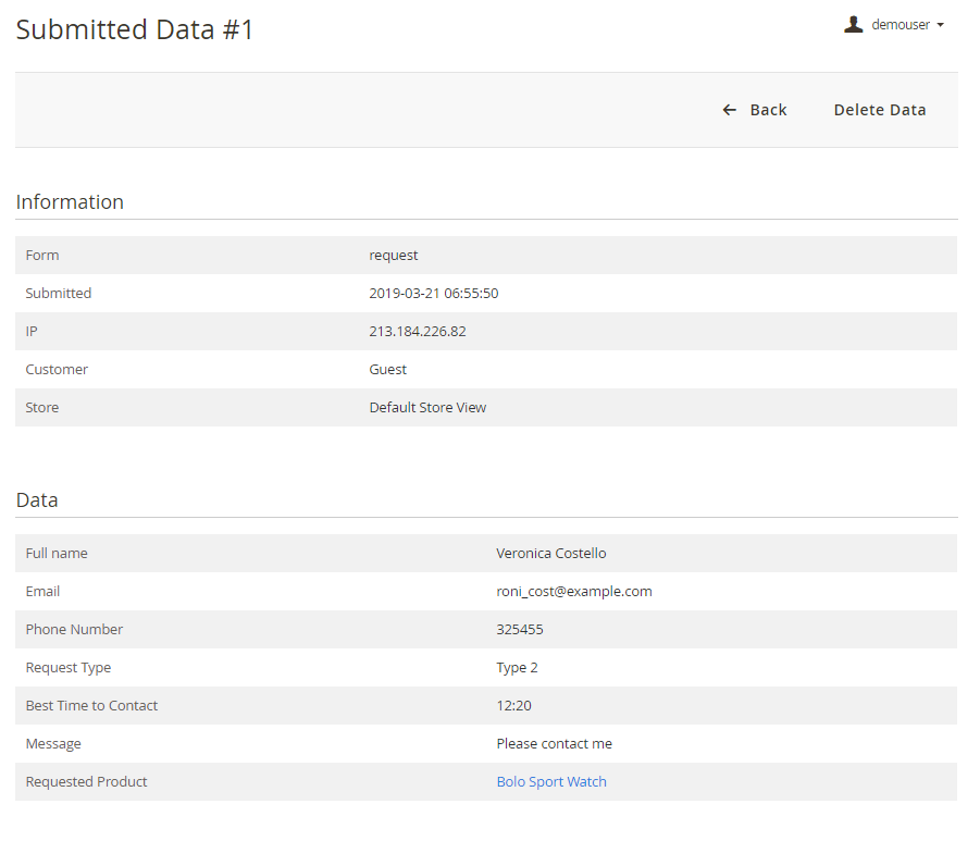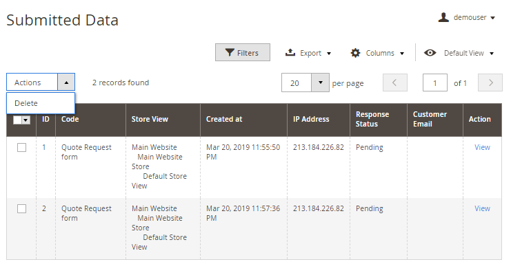 View all submitted data on the grid. You can easily delete requests via Actions dropdown menu.