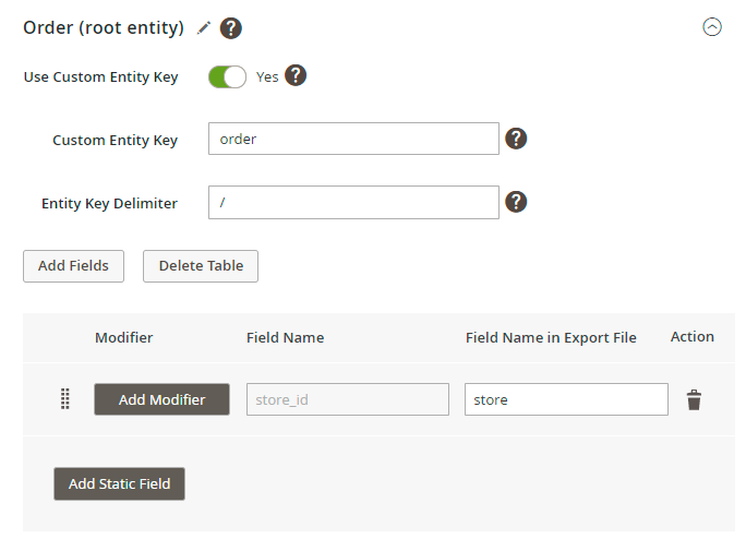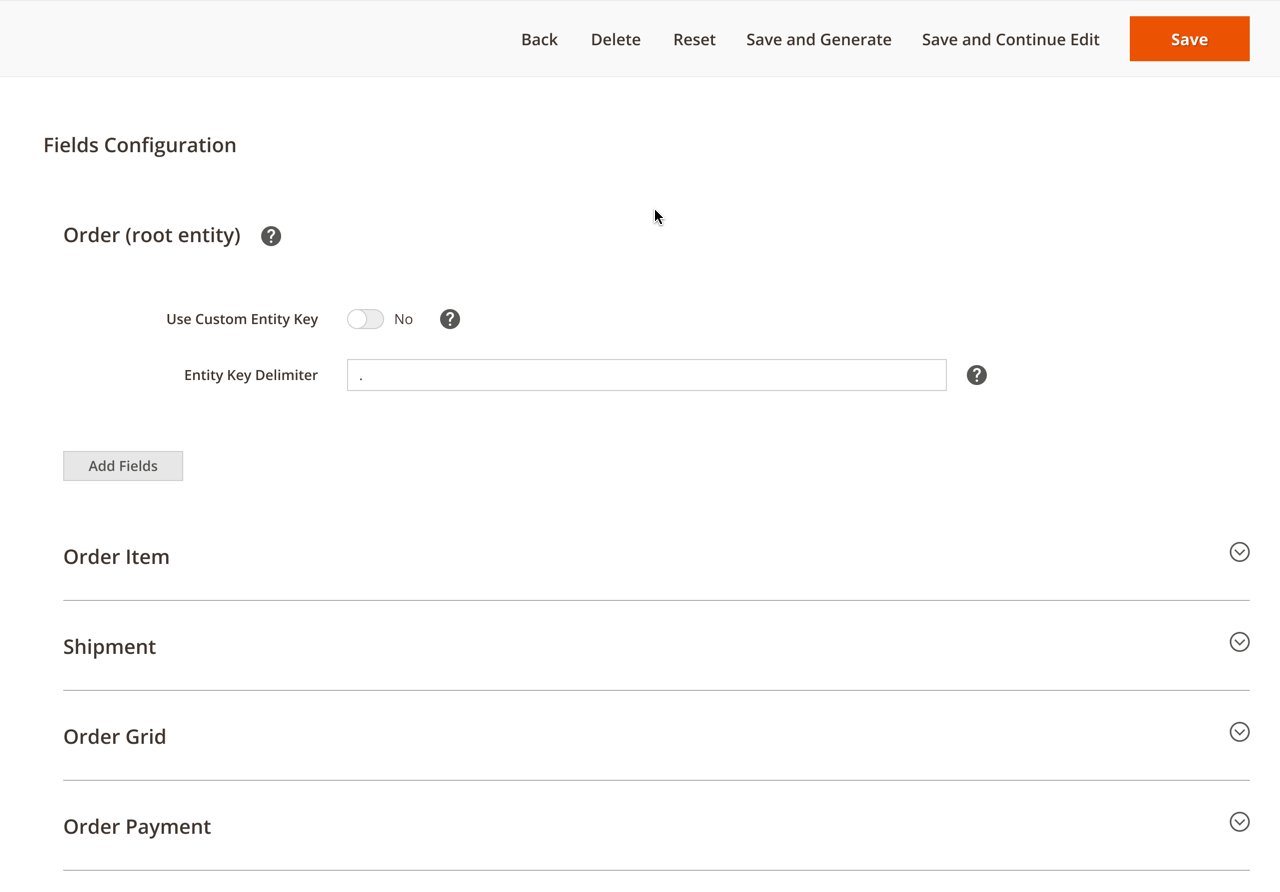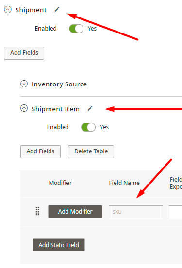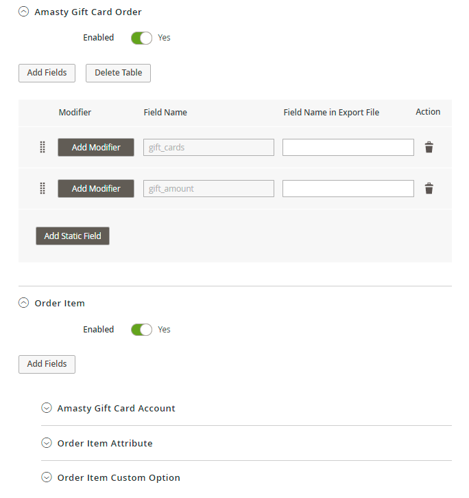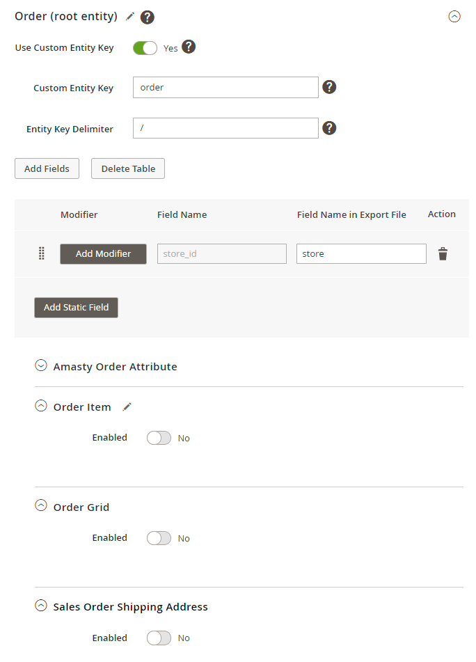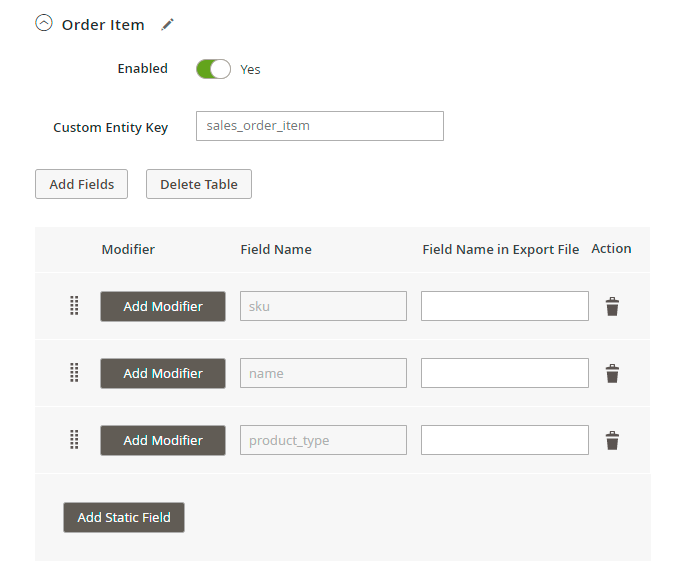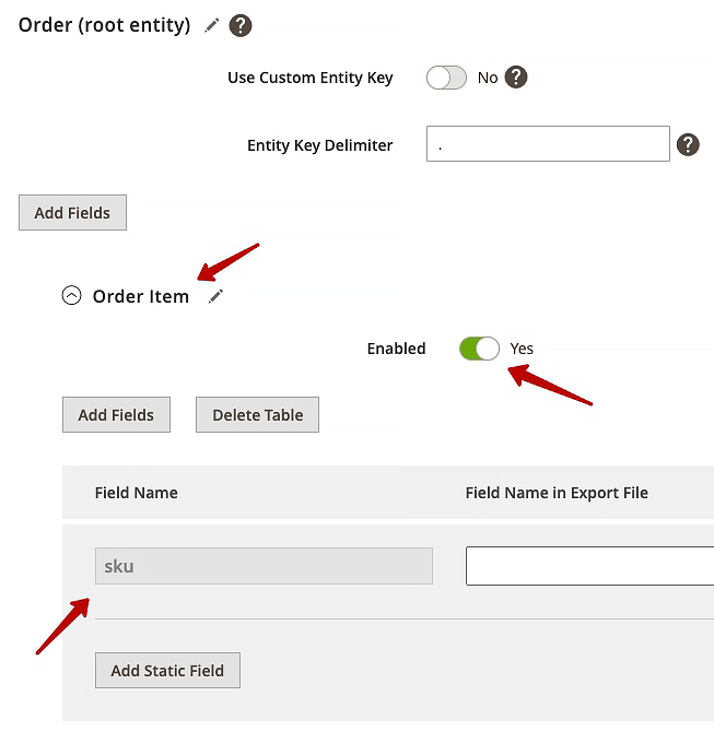 1. Enable the required subentity (‘Order Item’ for example) and add the fields you would like to export (‘sku’).
