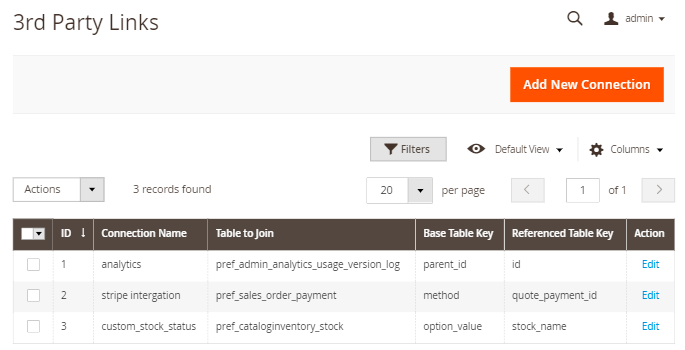 With the extension, you can link the data generated by 3rd party extensions to the export functionality. All created connections are displayed in the System → Export Orders/Products/Customers → 3rd Party Connections tab.