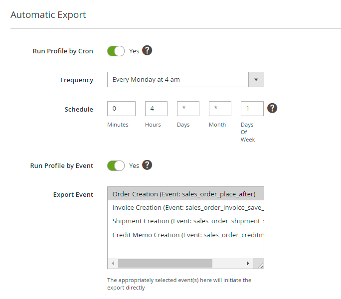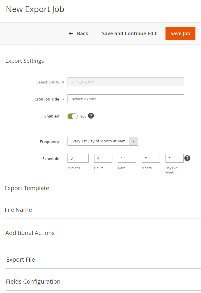 Specify the cron job title for internal use and set the schedule for exporting. The file configuration algorithm is the same as described in the Export Profile section.