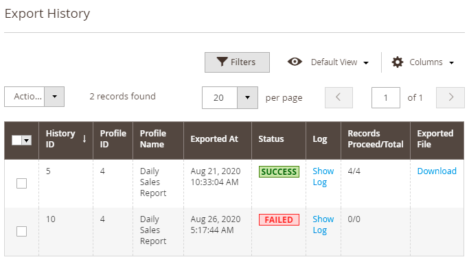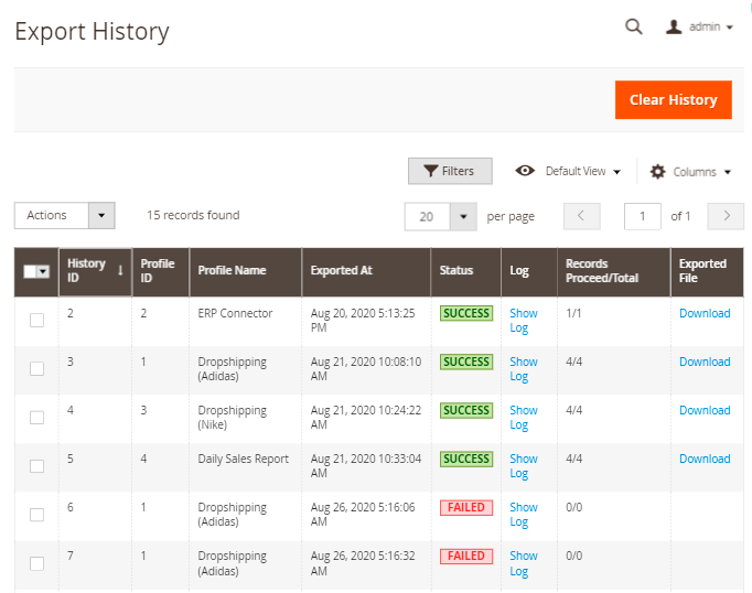 For each profile a separate export history is available. Check the statuses, dates, logs and the exported number of orders. Download a file if necessary.