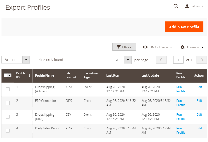 The extended order export functionality allows you to create flexible profiles for export and execute it on regular basis. To view all the profiles, proceed to System → Export Orders/Products/Customers → Profiles.