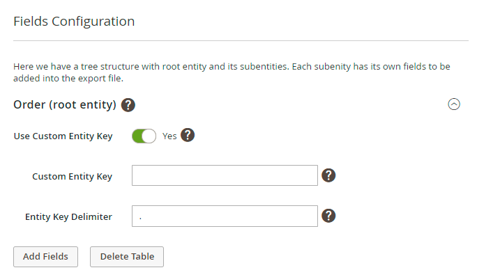 The functionality has a tree structure. Thus, you can add any entity, any field within a particular entity, customize entity keys/field names/delimiters and so on to match the requirements of the import.