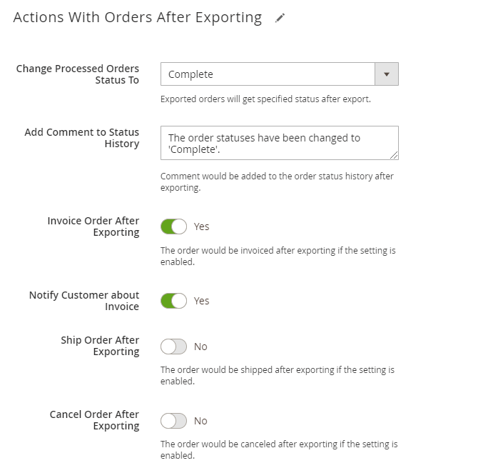 Invoice, Ship or Cancel orders after the export if needed. When any of these actions are enabled, you can additionally notify customers.
