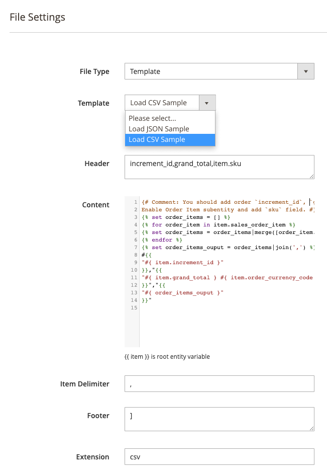 The extensions offers templates for .CSV and .JSON file types. To help you export subentities via .CSV using Twig template engine, please follow the steps below.