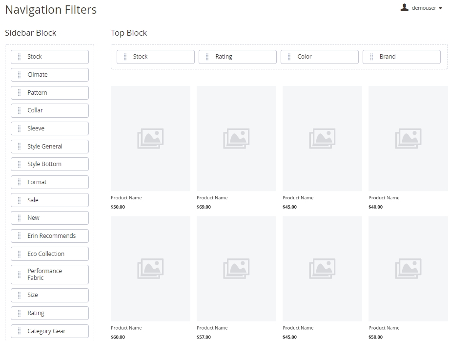 With Magento 2 Layered Navigation extension, you can display each particular filter block either in vertical or horizontal navigation. You can also select both options if needed. To adjust filter position, please go to Stores → Attributes → Product, pick up the needed attribute (filter), proceed to the Improved Layered Navigation tab, and then choose one of the three modes in a Show in the Block field.