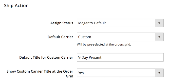 Show Custom Carrier Title at the Order Grid — if the option is set to No the default title will be automatically applied to orders once the custom carrier is selected in the carriers dropdown. If the option is set to Yes the title field will be displayed on the grid and can be edited for orders regardless of the chosen carrier;