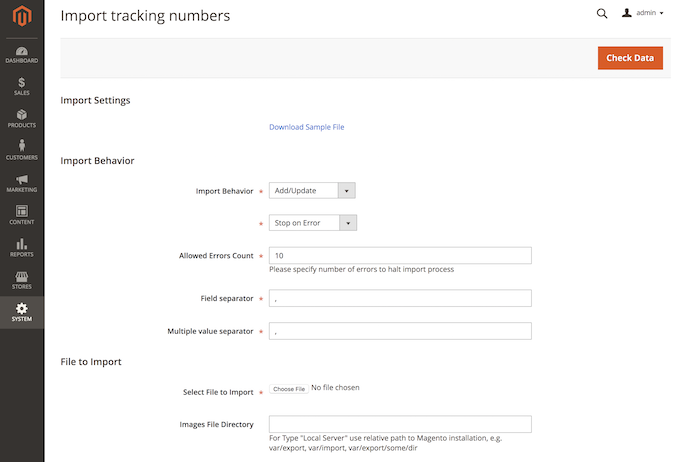 To import tracking numbers for the orders please go to System → Import Tracking Numbers.