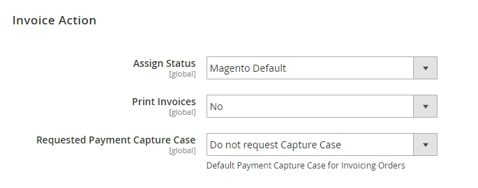 Requested Payment Capture Case — if your payment method auto-generates invoices, but you receive money after order placement, you should disable auto invoicing by choosing 'Do not request Capture Case'. Select 'Capture Offline' to create invoices manually or 'Capture Online' to connect the bank and reserve the amount needed for purchase from customers' card.