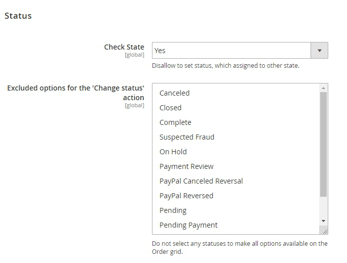 Excluded Options For The 'Change Status' Action — select statuses you don't want to see on your order grid to exclude them from the dropdown and display only necessary options.