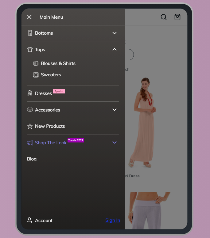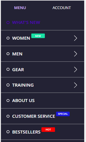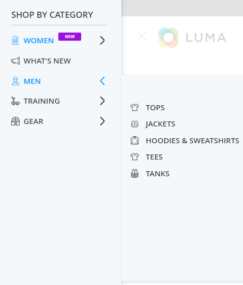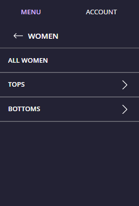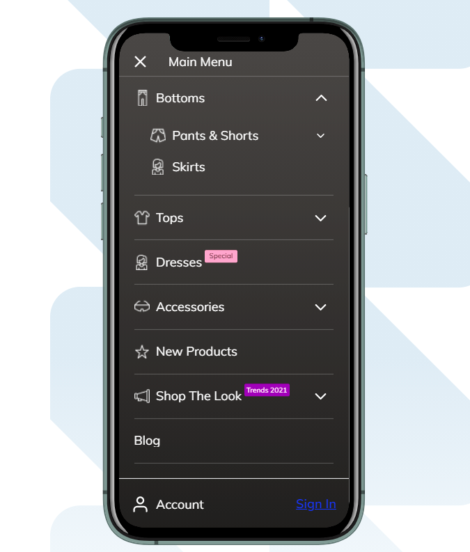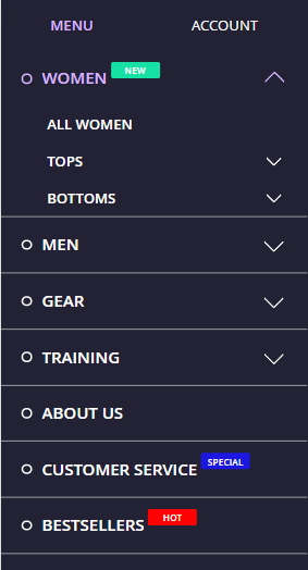 If the add-on is installed, Venia theme will display a Accordion Hamburger menu with icons in a dark color scheme in the following way: