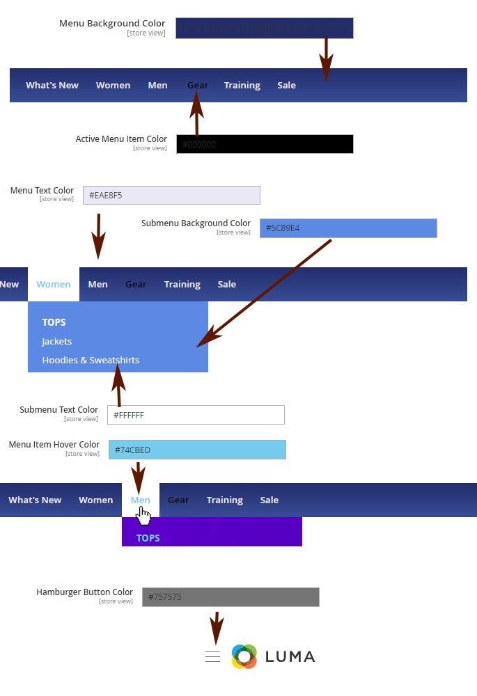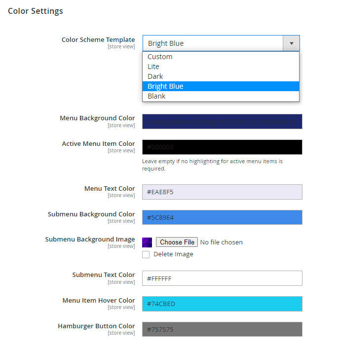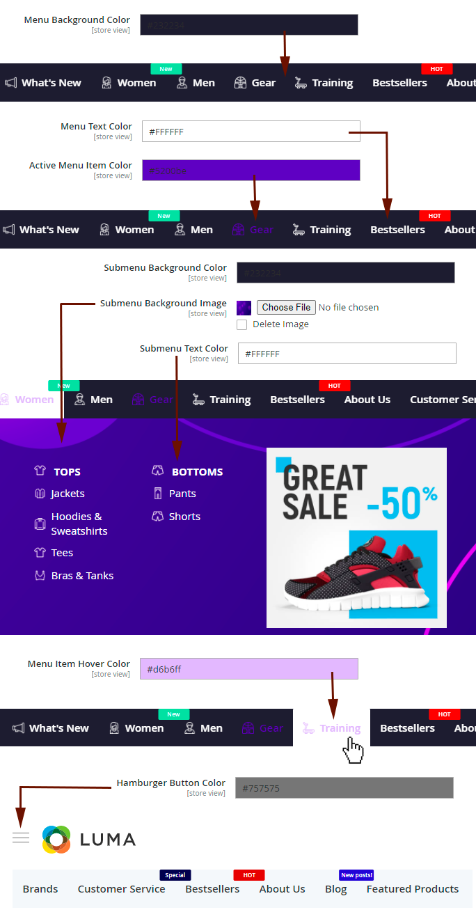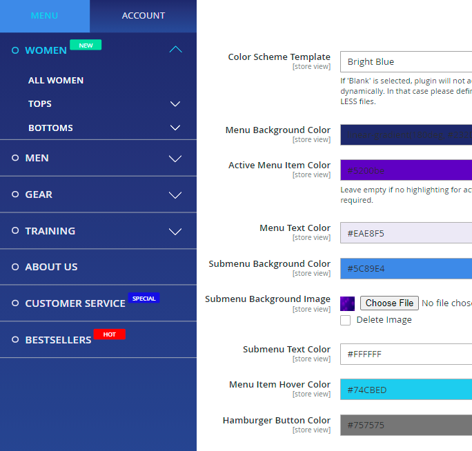 To choose a menu type and customize a color scheme, navigate to Stores → Configuration → Amasty Extensions → Mega Menu Lite.