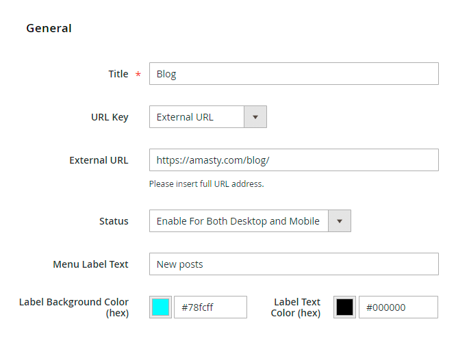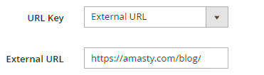 URL Key - set the URL to redirect customers after clicking the menu item: Internal URL or External URL.
