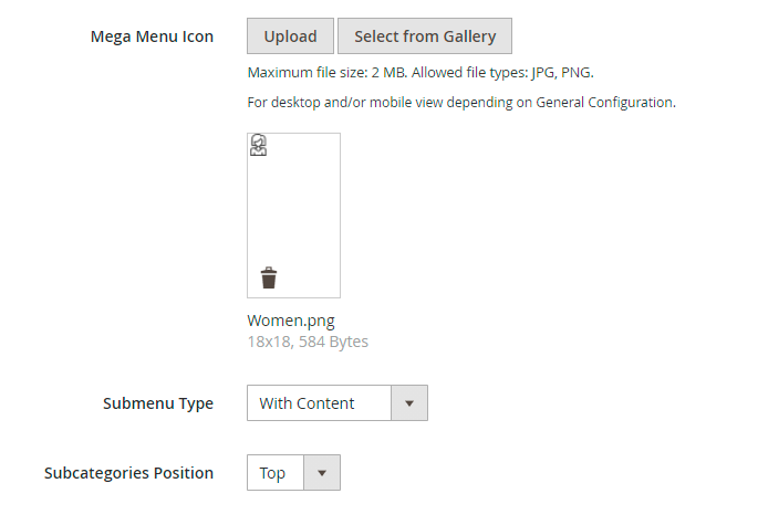 Mega Menu Icon - upload or select from the gallery an icon if you want to visualize the menu item. It can be applied to desktop and/or mobile view depending on General Configuration.