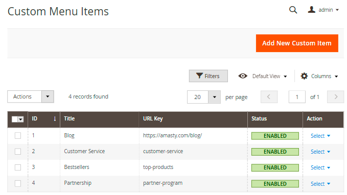 With the extension, you can add custom items to the menu bar. To see all additional items on a separate grid, go to Amasty → Mega Menu Lite → Custom Menu Items.