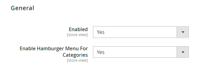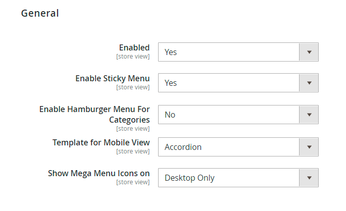 To set the general settings of the extension, go to Stores → Configuration → Amasty Extensions → Mega Menu Configuration.