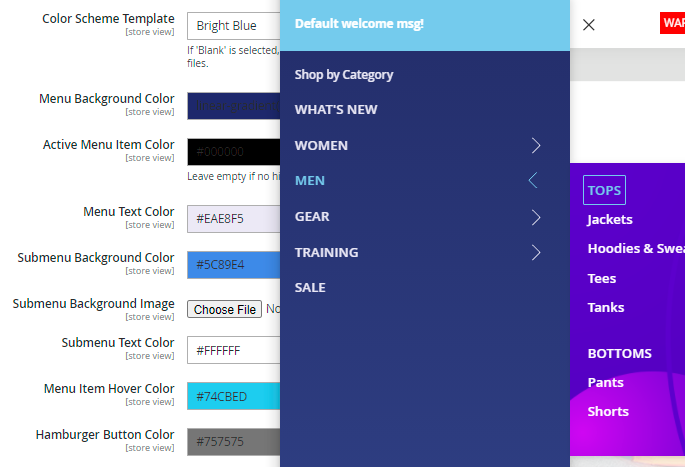 A color scheme customization for a hamburger, accordion and drill down menus have some peculiarities, e.g. Submenu Background Color is used for top tabs and Menu Item Hover Color is also used for a top tab with the default welcome message: