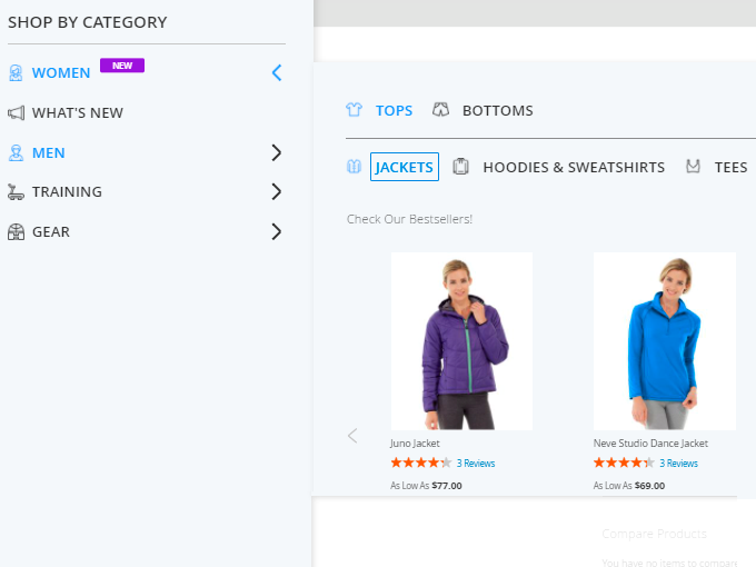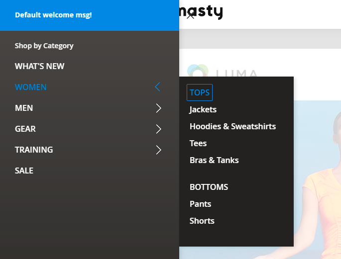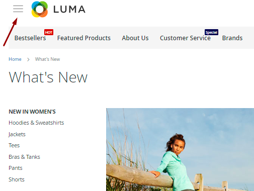 In the hamburger menu we've enabled the 'With Content' option for the Women category, and it becomes possible to configure the content for subcategories of any level. Also, the 'Subcategories Position' setting is set to Top. In the case below, we've added the product widget to the subcategory of the 2nd level, and the categories of the higher level are displayed at the top of the window.