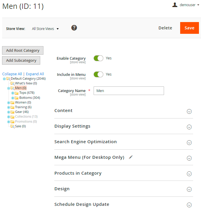 To adjust the display of default menu items, please go to Catalog → Categories and click the category you need.