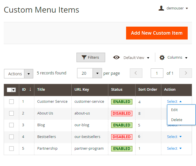 Here you can check the items' Title, URL Key, active Status and Sort Order.
