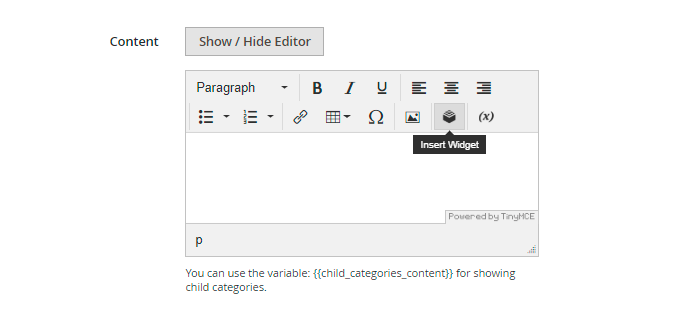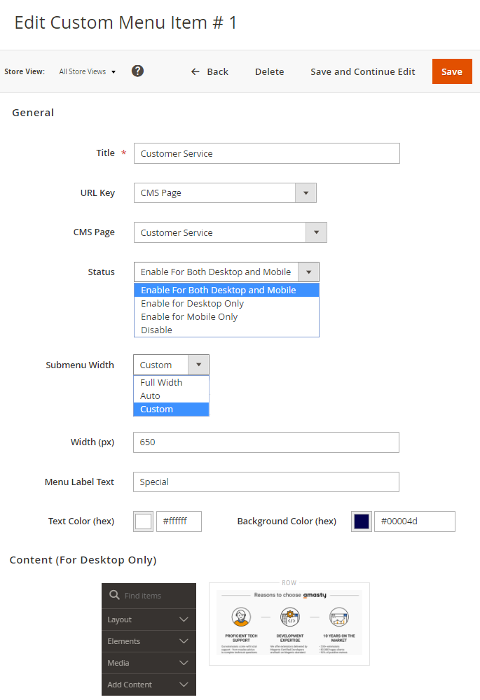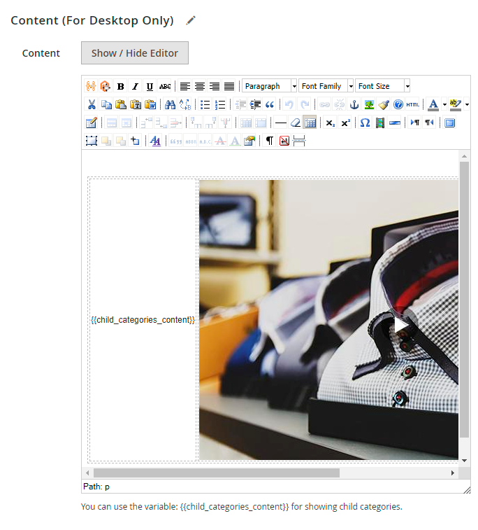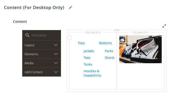 In this tab, you can adjust submenu content. The extension allows you to add images, videos, CMS blocks, banners, widgets and products. You can arrange elements the way you need using WYSIWYG editor. Also, the extension is fully compatible with the Page Builder for Magento Enterprise.