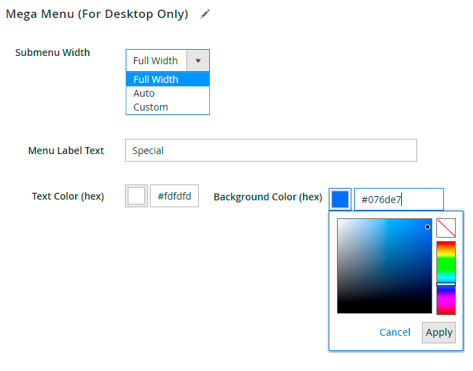 Menu Label Text - specify a text to highlight a custom item with a label if necessary.