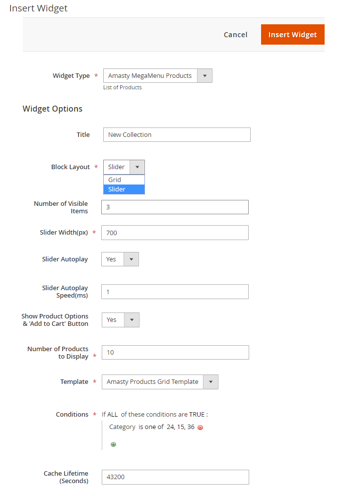 Widget Type - choose Amasty MegaMenu Products widget type.