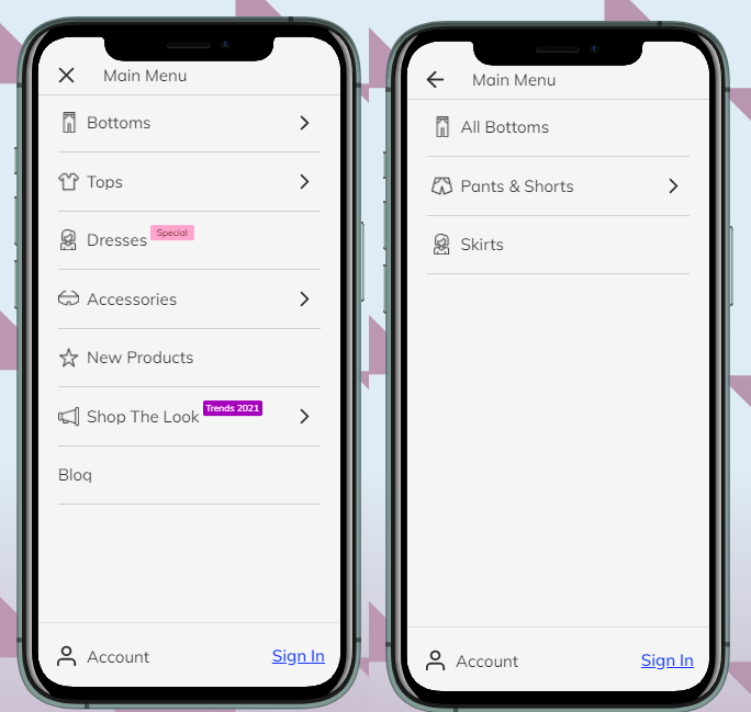 Icons can be added to the main categories and subcategories. In a hamburger menu it looks like this:
