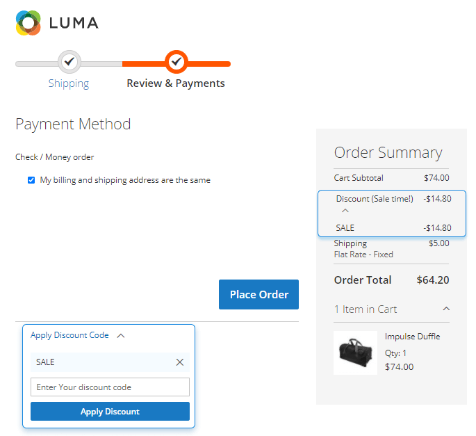 A customer can apply and remove multiple coupons on the checkout page. All the applied coupons are displayed in the Order Summary block.
