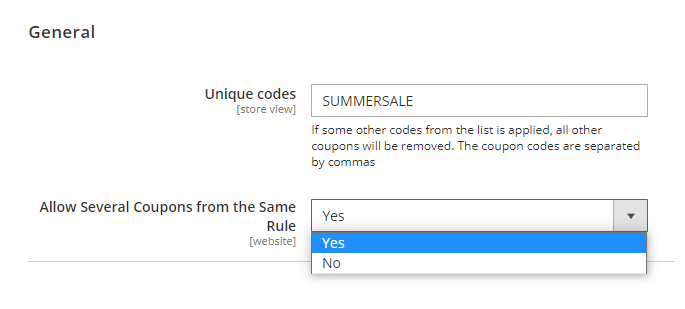 Unique codes - these are codes that can be applied only individually, e.g. if any of the codes from the list are applied, all other coupons will be canceled. You can specify multiple unique coupon codes separated by a comma.