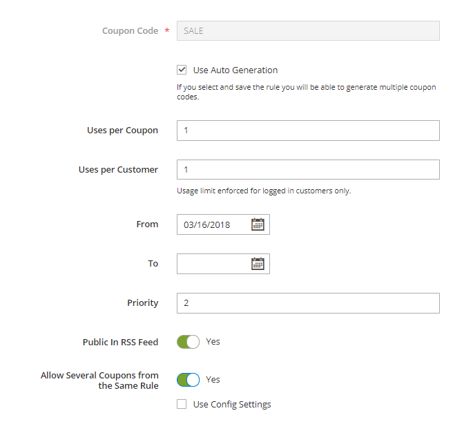Auto Generation - You can create Coupon Codes manually or use the 'Use Auto Generation' setting if you need multiple coupon codes. If this setting is selected the field 'Manage Coupon Codes' below becomes active. Learn more about how to configure this section below in this user guide.