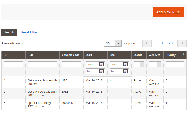 To configure coupons for your store please go to Marketing → Cart Price Rules. Create new rules by clicking on the 'Add new rule' button or edit the already existing one.
